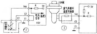 (2) 测量输入。信号电压。将点火开关置于 ON 位置,用万用表的电压挡测量图中 ECU 的 THA 与 E2 间的电压,该电压值应在 0 . 5 ~ 3 . 4V( 20 ℃ ) 范围内。若不在规定范围内,则应进一步检查进气温度传感器连接线路是否接触不良或存在断路、短路故障。 (3) 检查进气温度传感器连接线束电阻。用数字式万用表的电阻挡测量传感器插头与 ECU 插接器端子间电阻,即传感器信号端、地线端分别与对应的 ECU 的两端子电阻。如果不导通或电阻值大于 1 Ω,说明传感器连接线路或插头接触不良,应进一步捡查。
