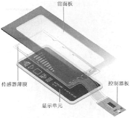 如图5 所示,一个触摸屏系统包括:前面板、传感器薄膜、显示单元、控制器板和系统软件。
