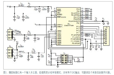 本设计中的电路包括一个混合信号微控制器、一只USBUART(通用异步接收器/发射器),还有一个新颖的自适应模拟传感器输入电路。此电路可以将多种类型的传感器接到设计的两个模拟输入通道上,在一个USB主机上控制这些设备,读出测量数据。USB连接为电路提供电源。在计算机上就能用简单指令控制设备;甚至用终端软件也可以做测量工作。8051核有免费的工具, 便于做编程工作, 如IDE(集成开发环境)、调试器以及C编译器?! ?br />