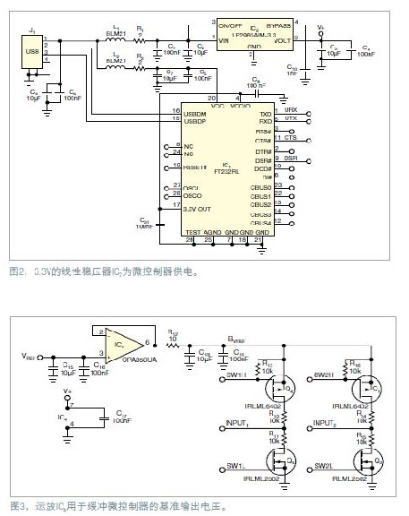 3.3V的线性稳压器IC2为微控制器供电(图2)。从USB端口通过磁珠与滤波器,就可以直接为USB芯片IC1供电。这款芯片是常见而可靠的USBUART芯片,可与使用任何操作系统的计算机通信。运放IC4用作微控制器基准输出的缓冲(图3)。