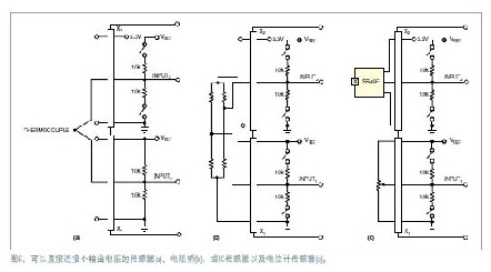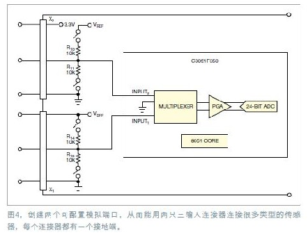 高分辨率ADC与PGA可以直接连接热电偶(图6)。通过切换一个通道上的上拉电阻和下拉电阻,就可以实现所需的偏置点。关掉所有内置电阻,就可以采用直接连接的桥式传感器(如测压元件和压力传感器)。这些情况下,应使ADC工作在差分模式。让所有开关开路亦适合于采用电位器输入或IC 传感器的场合,如SS49E霍尔效应磁场传感器?! ?/p>