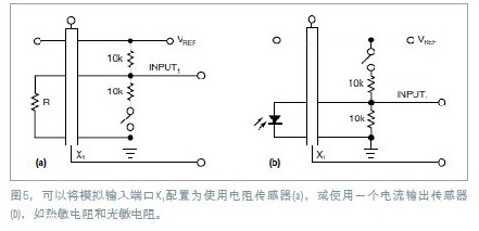 模拟输入架构能够直接连接多种类型的传感器。例如,可以在接地端与输入端之间连接热敏电阻或光敏电阻,并接通上拉电阻,构成一个分压器;片上的ADC可以直接对这个分压器的输出做数字化(图5)。这种方案还采用了比率工作方式,意味着ADC使用与分压器驱动电压相同的电压基准。电流输出传感器也可以像光电二极管那样连接,即直接连到接地端与输入端之间。切换到下拉电阻,使光电流能产生一个电压?! ?/p>