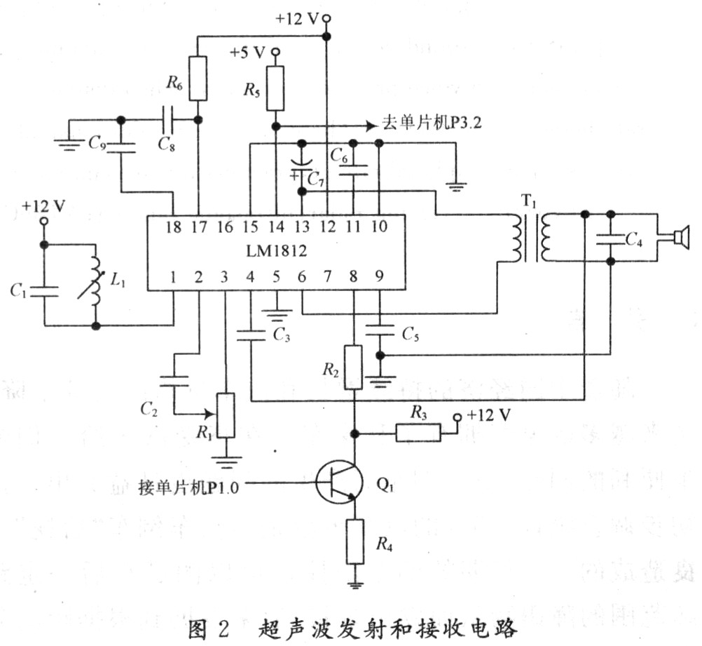 本系统采用超声波专用集成电路LM1812作为超声波发射和接收电路的主控芯片。LM1812是一种通用型超声波收发器,主要用在各种各样的测距、定向和通信中。芯片包括一个脉冲调制C类发射器,一个高增益接收器,一个脉冲调制检测器及噪音抑制电路。LM1812第1脚外接L1,C1决定了电路发送或接收的工作频率,其工作频率为: