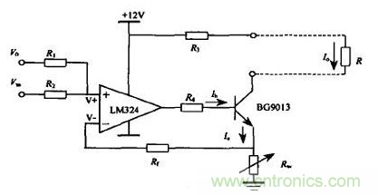 由图1可见,电路主要元件为一运算放大器LM324和三极管BG9013及其他辅助元件构成,V0为偏置电压,Vin为输入电压即待转换电压,R 为负载电阻。其中运算放大器起比较器作用,将正相端电压输入信号与反相端电压V-进行比较,经运算放大器放大后再经三极管放大,BG9013的射级电流Ie作用在电位器Rw上。