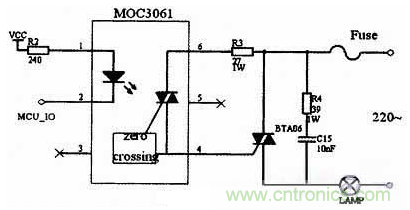 本系统由光电传感器检测洗手间内是否有人,单片机进行计数,当N不为零时,单片机会向与MOC3061芯片引脚相连的端口输送信号,然后通过可控硅来控制灯的开、关。其中R3是双向可控硅的门极电阻,当可控硅灵敏度较高时,门极阻抗也很高,并上R3可提高抗干扰能力。 39Ω电阻和0.01μF电容组成浪涌吸收电路,防止浪涌电压损坏双向可控硅。其电路图如图4所示。