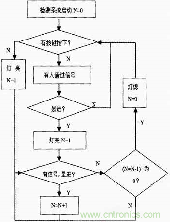系统流程图如图5所示。其中N表示洗手间内现有的人数,当检测系统电源连上后,光电传感器开始检测,但系统不知道洗手间内此时是否有人,默认是无人,因而灯是不会亮的,这时按键可以用来对系统进行调整。当光强增大到一定值时,检测系统自动停止工作。
