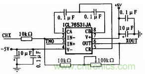 信号放大电路采用ICL7653斩波稳零运算放大器来 完成,如图2所示。ICL7653具有极低的失调电压和偏置电流,具有较高的工作稳定性和优良的高精度放大功能。ICL7653斩波稳零使用内部时钟时, 在CA、CB与CR端之间加上0.1 μF的低泄放、高稳定性的聚酯或聚丙烯电容。同时在双电源接入端进行滤波和去耦处理。