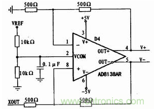 如图3所示,差分转换电路以AD8138AR为核心,将单端信号转换差分信号,既可以提高共 模抑制比,有效减小共模信号影响,又可以驱动SOC内部的24位差分Sigma-Delta模/数转换器。AD8138AR具有较宽的模拟带宽(320 MHz,-3 dB。增益为1时),而且AD8138AR为表面封装器件,器件体积小,使得ADC与信号输入点的距离可以很近,大大减少了外界噪声的影响。