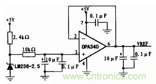 MEMS倾角传感器SCA100T在倾角为0°时,模拟输出为其电源电压的1/2倍,如果倾角传感器电源电压有波动,则其输出会产生相应的波 动。因此设计时,将给模数转换电路提供基准源的输出(如图4所示),经过提高驱动能力后,提供给MEMS倾角传感器SCA100T作电源(如图5所示)。 一方面,基准源输出纹波极小,且性能稳定;另一方面,模数转换器的基准源和MEMS倾角传感器SCA100T的电源同时向相同方向变化,抵消了MEMS倾 角传感器因电源引起零点漂移的影响。