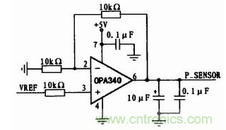 图5中的输入为图4中的参考电压(VREF)输出。以低漂移、高稳定性运放OPA340组成的运放电路给倾角传感器SCA100T提供电源,能保证电源纹波小,工作稳定。