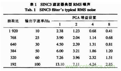 C8051F350内部有具有2个独立的抽取滤波器(SINC3滤波器和快速滤波器)和1个可编程增益放大器。根据参考文献SINC3滤波器RMS噪声小,精度高,缺点是输出速率较低,而快速滤波器则相反。本设计对速率要求低,而对精度要求高,因此选用SINC3滤波器。SINC3滤波器典型RMS噪声如表1所示。