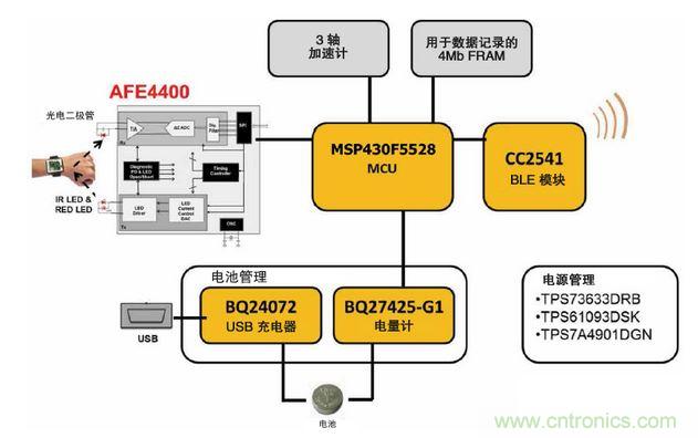 图4中就是这样一个TIDesign (TIDA-00011),其中展示了一个典型的光学、佩带在手腕上的心率系统应用。这个手腕佩带式心率监视器参考设计说明了TI技术是如何组合在一起来提供完整解决方案的。使用一个LED到光电二极管光信号的转换,TI的AFE4400($3.3188)感测由佩带者脉搏跳动所引起的皮肤表面变化,然后将模拟信号放大并转换为数字信号,然后再将此数字信号传递给MSP430($2.0250) MCU。基于TI SimpleLinkTM Bluetooth低能耗CC2541($2.3625)无线MCU的??樘峁┑街悄苁只蚱渌镜叵低车奈尴吡印7且资蕴缢婊娲⑵魈峁┦菁锹脊δ?,而加速计感测身体运动。此参考设计还包括管理电池电量和不同系统功能的器件。希望设计此类终端设备的开发人员可以从TI直接访问所有内容,原样搭建这一系统,并且立即运行。在这里,要定制解决方案,开发人员只需添加其自己的知识产权即可。