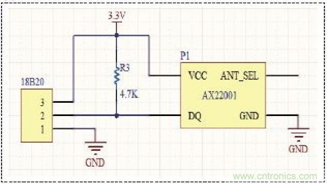 温度采集单元主要有传感器、处理器和电源组成,传感器18B20负责区域内温度信息的采集和数据转换,将温度的传感器信息经过A/D转换,得到数字信息,供处理器AX22001进行处理。其原理图如图1所示,其中ANT_SEL引脚接天线,用来传送无线信号。