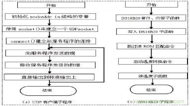 根据DS18B20的通讯协议,主机(单片机)控制DS18B20完成温度转换必须经过三个步骤:每一次读写之前都要对DS18B20进行复位操作,复 位成功后发送一条ROM指令,最后发送RAM指令,这样才能对DS18B20进行预定的操作。该流程框图如图2(b)所示。