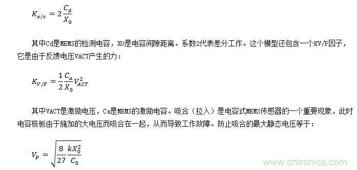 MEMS传感器的工作原理基于这样一个事实:给MEMS施加一个输入力(Fin)将产生一定的位移,进而改变MEMS电容(Cout)。这个Cout可以用连接MEMS单元的电路进行测量。带激励电极的MEMS传感器建模如图1所示。这个模型的增益是Kx/c,代表由于MEMS质量块位移引起的输出电容变化。Kx/c等于: