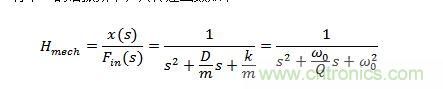 实现闭环工作的另外一种方法使用两级bang-bang反馈信号。由于只用到两个点的二次V/F关系,这种方法天生就是线性的,而且并不依赖MEMS电容的匹配或使用负电压去抵消非线性。使用两级激励意味着将反馈信号幅度中的信息转换为时间信息。因此Σ-Δ调制可以成为实现闭环数字读取传感器的一种有效技术。另外,基于Σ-Δ的环路默认提供模数转换功能,因此不需要再使用单独的A/D。Σ-Δ闭环架构代表了高性能数字读取传感器的最优架构。值得注意的是,Σ-Δ系统的超采样特性会使操作系统工作在相对较高的频率,因此系统变得较易受MEMS寄生电容耦合的影响。尽管如此,抵消这种耦合的电路技术已经非常成熟,并且可以在传感器的接口ASIC中实现。Σ-Δ闭环传感器的架构选择需要依据为电子Σ-Δ系统开发的深层技术。然而,具有自然电子-机械特性的Σ-Δ闭环传感器在系统级设计与优化时需要正确理解MEMS的工作原理和建?;?。典型MEMS传感器的检测部分行为就像是一个二阶集总式质量块(阻尼器)弹簧机械系统,具有单一的谐振频率,其传递函数如下: