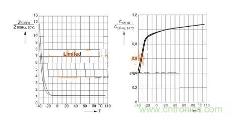 在铝电解高压电容器的正常运行过程中,其本身的电解液导电性,将会随着环境温度的降低而降低,从而会导致电解液阻抗的增加,阻抗和损耗角正切也会因此而增大。在绝大多数应用中,相应增加仅允许到某最大值。在这里需要强调的一点是,低于上述温度限值的工作并不会损坏高压电容,仅仅只是会影响其使用寿命,尤其是当纹波电流流经器件时,由于增加ESR而产生的热量耗散会提高电容器温度,使其远大于环境温度,使电容可维持设备运行。下图所示为下限类别温度为-25℃电容器的阻抗和电容典型值。