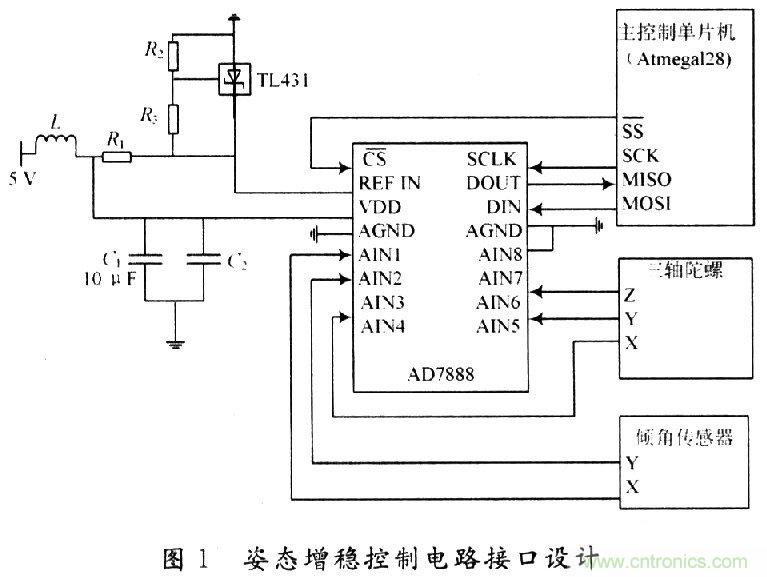 无人机内回路控制作为外回路控制的基础,对其能否稳定飞行起着至关重要的作用。该系统中,内回路是由三轴陀螺和倾角传感器构成的姿态增稳控制回路。主要由主控制单片机、A/D采样芯片、三轴陀螺仪和倾角传感器组成。主控制单片机通过SPI串行总线与A/D采样芯片相连,通过A/D采样芯片获得三轴陀螺仪的角速率与倾角传感器的横滚角和俯仰角,然后进行姿态信息融合,得到无人机俯仰和横滚的姿态信息。主要接口连接情况如图1所示。