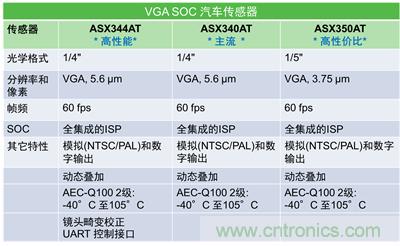 ASX344/340/350AT是用于倒车影像的系统级芯片(SoC),在单芯片上集成图像信号处理器,增强的像素性能提供微光条件下的更高能见度,支持高达4层的图像叠加以向显示系统提供更多的倒车信息,支持数字缩放和平移,并附加光学中心点矫正功能,这可为客户提供相机组装生产后镜头中心点矫正功能,从而节省成本。这三款图像传感器都完全通过AEC-Q100认证,并具备-40°C至105°C的宽工作温度范围,它们的不同之处在于:ASX344AT还集成鱼眼畸变校正功能和提供UART控制接口,定位为“高性能”的方案;ASX350AT的光学格式为1/5英寸,不同于ASX344/340AT的1/4英寸,定位为“高性价比”的方案;而ASX340AT定位为“主流”方案。设计人员可根据目标客户的具体需求选择有针对性的方案。