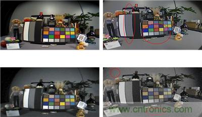 ASX34xAT系列在白天(典型情况为100-200lux明亮的光)和夜晚(典型情况为汽车倒车摄像头在夜晚约10lux使用刹车灯和倒车灯)都较同类竞争器件提供更好的色彩饱和度和对比度,如图2红圈所示,在白天180lux的光照条件下,竞争器件采集到的图像过度锐化,且色彩边界有灰斑;在夜晚微光9.5lux的光照条件下,竞争器件采集到的图像过度锐化,且有更多的噪声。