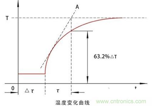 实践证明热电偶、热电阻、双金属温度计当被测温度突然发生变化时,其输出会延迟一段时间,这段延迟时间△τ一般叫做纯滞后或纯时延。在延迟△τ后,会以近似于指数曲线的规律变化(如下图所示),如忽略△τ,并以介质温度变化做计时起点,则上述曲线符合T=△T(1-e-t/τ),此式中T为温度;△T为温度变化;t为时间;τ为时间常数。时间常数及时反应曲线起点的切线与平衡温度交点A所对应的时间,也就是输出变化63.2%△T所需要的时间。