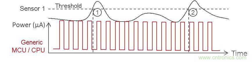 当外部事件超过传感器阈值时才唤醒 CPU 并不是一个革命性的概念。本质上,它会将恒定的 MCU 工作周期从图 1 中移至单个事件;当模拟事件超过给定阈值时,MCU 苏醒并执行各种行动。