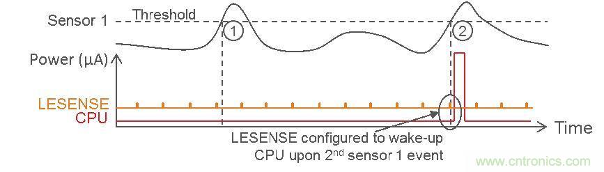 在以下概念图中,LESENSE 被配置为允许传感器 1 超过其可配置阈值两次之后才唤醒 CPU。