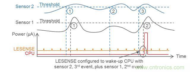 在图 3 中,LESENSE 对传感器 2 的事件 1、2 和 3 的测量信息进行缓冲,并在唤醒核心之前将这些信息与传感器 1 的事件 1 和 2 的测量数据相结合。这个简单的使用实例采用 LESENSE 的单独配置传感器、低功耗内存 和低功耗状态机。