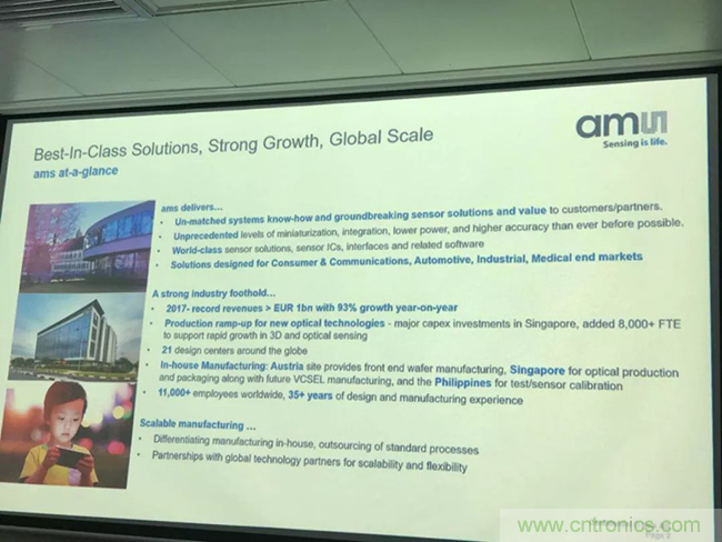 艾迈斯半导体的新型光学技术产量不断提升,以新加坡为主要资本投资市场,针对最新的具有人脸识别技术的高端智能手机进行了相关投产。在8到9个月的时间里新增了8000多名全职员工,以支持3D和光学传感领域的迅速增长。艾迈斯半导体在全球拥有多个生产基地,其中,奥地利工厂负责前端晶圆制造,新加坡负责光学传感器生产和封装以及未来VCSEL制造,菲律宾负责测试/传感器校准。去年,艾迈斯半导体大概只有2000多名员工,今年已经有超过11000名员工了。艾迈斯半导体非常积极地扩展制造能力,与全球技术合作伙伴开展合作,为客户提供差异化解决方案。