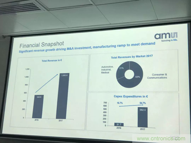 据介绍,艾迈斯半导体的营业收入去年到今年的增长用欧元计价是93%,用美元计算是100%。其中消费和通讯市场占了70%,这里面最主要的还是手机市场。另外31%是汽车、工业与医疗市场。而且,总体来说,两边的市场规模都增长得非???。“为了进一步支持这个增长,我们在资本和研发的投资是非常巨大的。当然我们利润增长也很高,大概74%,这也说明我们公司的盈利状况也很好。” Everke说。