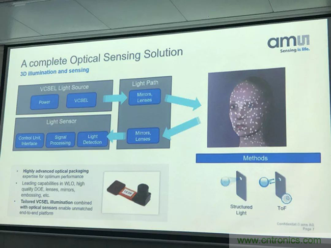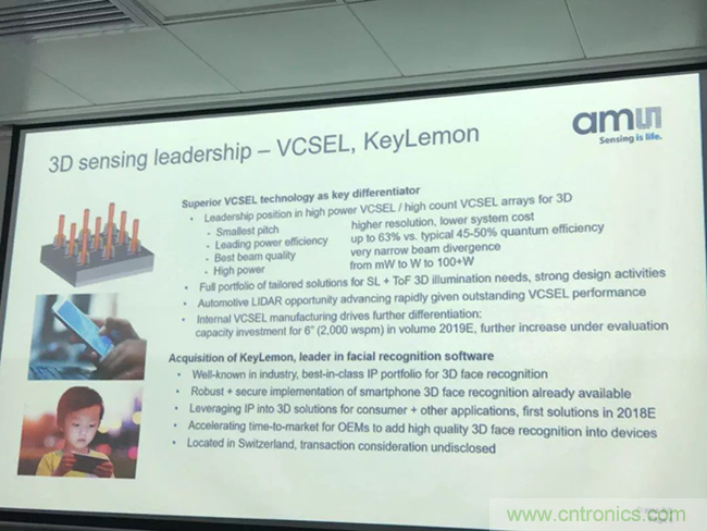 收购案例#2:艾迈斯半导体曾收购一家在做面部识别软件方面特别强的企业KeyLemon,这家公司已有7年的历史了,具备领先的3D人脸识别知识产权库。同时,他们的软件现在已经能在安卓系统中运行了。因此,艾迈斯半导体可以在消费类应用中提供可用于3D感应的软件+硬件解决方案。“我们本身的传感优势,加上收购企业的技术,我们便可提供世界一流的完整解决方案。除了VCSEL之外,还有TOF(飞行时间)和结构光等,可以通过我们的传感技术整合成一个完整的解决方案。” Everke指出。
