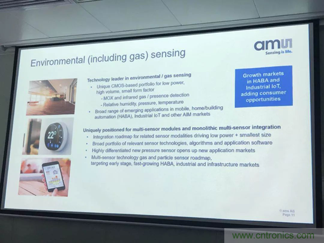 在环境方面,艾迈斯半导体有温度、压力、气体、湿度传感器,会应用于IoT市场或者是移动市场。艾迈斯半导体可以把所有的这些传感功能集成到单芯片上,因此,它可以做得非常小,但是功能又非常齐全。艾迈斯半导体的压力传感器非常有趣,它的灵敏度可以根据气压来测量,这个可以用于室内GPS。