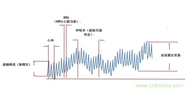 光学心率传感器可生成测量心率的PPG波形并将该心率数据作为基础生物计量值,但是利用PPG波形可以测量的对象远不止于此。尽管很难取得和维护精确的PPG测量结果(我们将在下一篇详细论述它),但是如果您能够成功获得精确的PPG测量结果,它将发挥强大的作用。高品质PPG信号是当今市场需求的大量生物计量的基础。图2是经过简化的PPG信号,该信号代表了多个生物计量的测量结果。