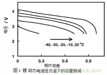 锂动力电池在不同低温下的放电容量曲线如图1所示,与室温20℃相比,低温-20℃下容量衰减已经比较明显,到-30℃是容量损失更多,-40℃下容量连一半都不到了。