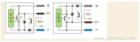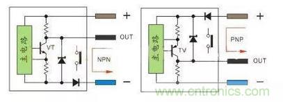 PNP型当传感器有检测信号VT导通,正极的电流流向输出端OUT,输出端OUT电位接近正极,通常说的低电平翻转成高电平。