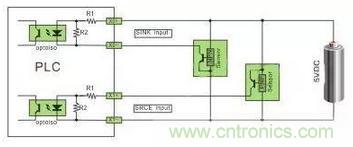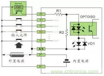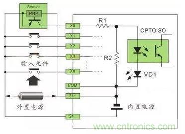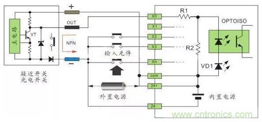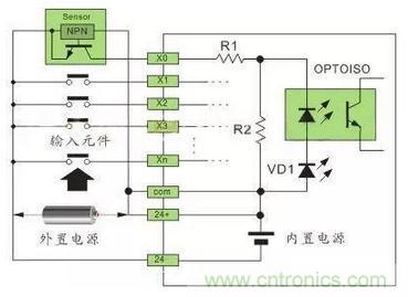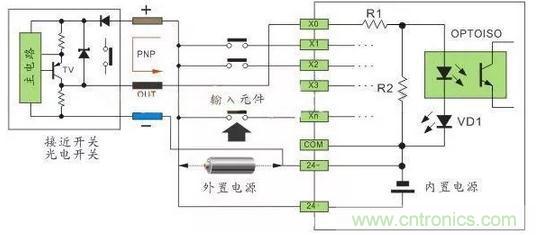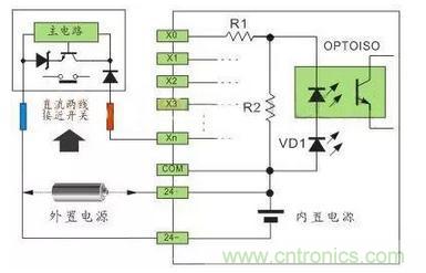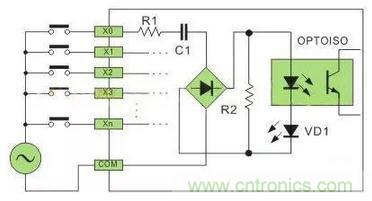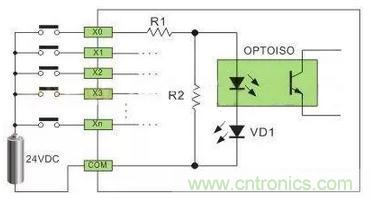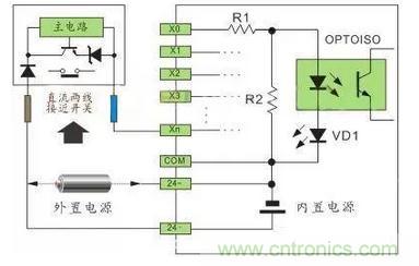直流电可以由PLC内部提供也可以外接直流电源提供给外部输入信号的元件。R2在电路中的作用是旁路光电耦合器内部LED的电流,保证光电耦合器LED不被两线制接近开关的静态泄漏电流导通。