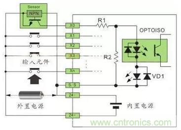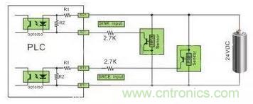 注:24VDC供电的传感器,在输入回路上需要串联限流电阻,R1为10Ω,R2为2KΩ,不串联限流电阻,将烧毁接口回路,限流电阻取值2.7KΩ。
