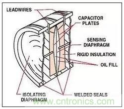 差动电容式压力传感器的受压膜片电极位于两个固定电极之间,构成两个电容器。在压力的作用下一个电容器的容量增大而另一个则相应减小,测量结果由差动式电路输出。它的固定电极是在凹曲的玻璃表面上镀金属层而制成。过载时膜片受到凹面的?;ざ恢缕屏选2疃缛菔窖沽Υ衅鞅鹊サ缛菔降牧槊舳雀?、线性度好,但加工较困难(特别是难以保证对称性),而且不能实现对被测气体或液体的隔离,因此不宜于工作在有腐蚀性或杂质的流体中。